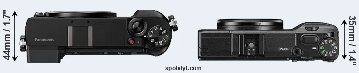 An illustration of the physical size and weight of the Panasonic GX80 and the Ricoh GR II is provided in the side-by-side display below. The two cameras are presented according to their relative size. Three consecutive views from the front, the top, and the rear side are shown. All width, height and depth dimensions are rounded to the nearest millimeter.