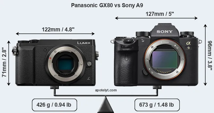 If the front view area (width x height) of the cameras is taken as an aggregate measure of their size, the Sony A9 is notably larger (41 percent) than the Panasonic GX80. Moreover, the A9 is substantially heavier (58 percent) than the GX80. It is noteworthy in this context that the A9 is splash and dust-proof, while the GX80 does not feature any corresponding weather-sealing.
