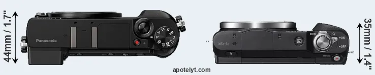 An illustration of the physical size and weight of the Panasonic GX80 and the Sony NEX-3N is provided in the side-by-side display below. The two cameras are presented according to their relative size. Three successive views from the front, the top, and the rear are shown. All width, height and depth dimensions are rounded to the nearest millimeter.