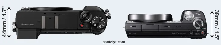 The physical size and weight of the Panasonic GX80 and the Sony NEX-5N are illustrated in the side-by-side display below. The two cameras are presented according to their relative size. Three consecutive perspectives from the front, the top, and the back are available. All width, height and depth dimensions are rounded to the nearest millimeter.