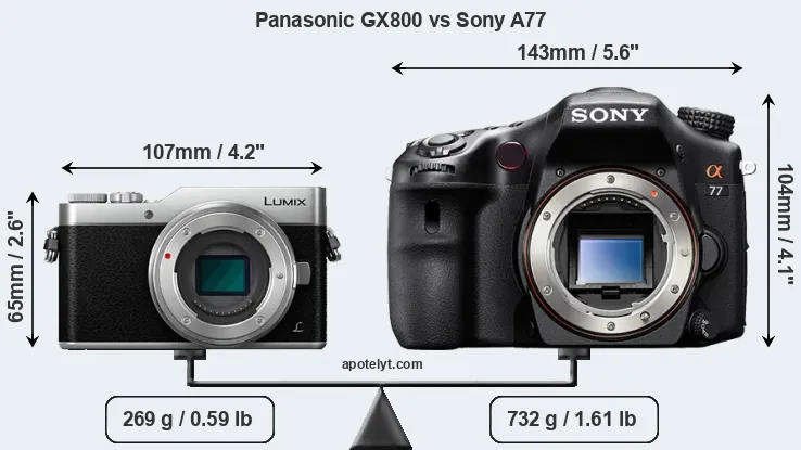 If the front view area (width x height) of the cameras is taken as an aggregate measure of their size, the Sony A77 is considerably larger (114 percent) than the Panasonic GX800. Moreover, the A77 is substantially heavier (172 percent) than the GX800. It is noteworthy in this context that the A77 is splash and dust-proof, while the GX800 does not feature any corresponding weather-sealing.