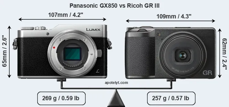 An illustration of the physical size and weight of the Panasonic GX850 and the Ricoh GR III is provided in the side-by-side display below. The two cameras are presented according to their relative size. Three successive views from the front, the top, and the rear are shown. All size dimensions are rounded to the nearest millimeter.