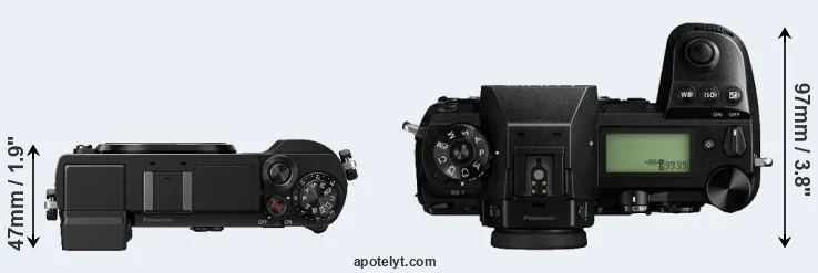 The physical size and weight of the Panasonic GX9 and the Panasonic S1 are illustrated in the side-by-side display below. The two cameras are presented according to their relative size. Three consecutive views from the front, the top, and the rear side are shown. All width, height and depth dimensions are rounded to the nearest millimeter.