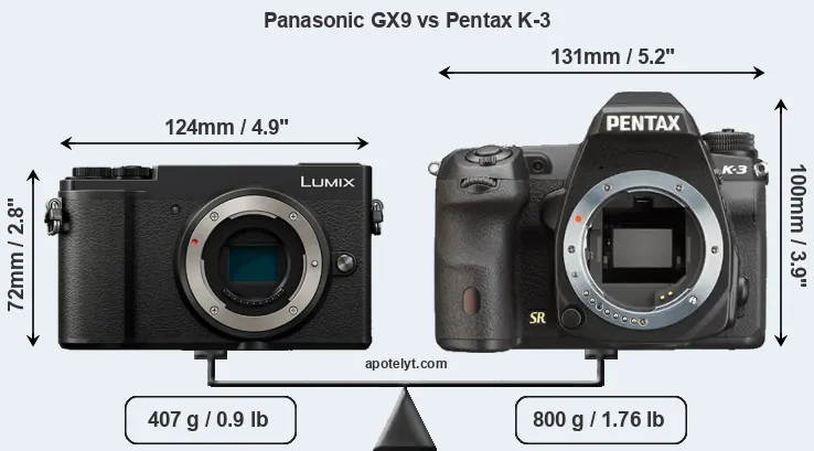 The physical size and weight of the Panasonic GX9 and the Pentax K-3 are illustrated in the side-by-side display below. The two cameras are presented according to their relative size. Three successive views from the front, the top, and the rear are shown. All width, height and depth measures are rounded to the nearest millimeter.
