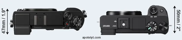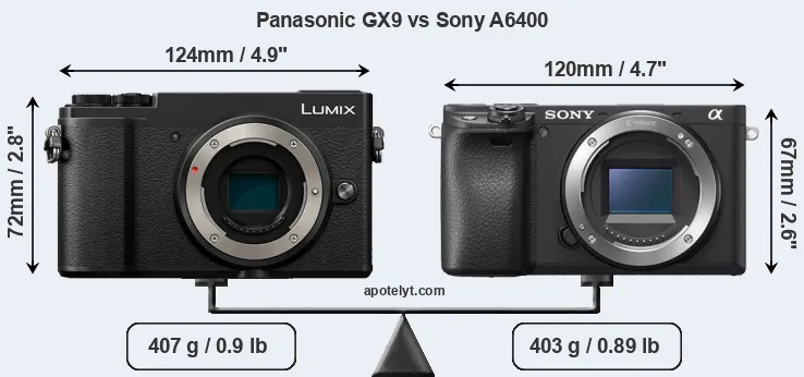 The physical size and weight of the Panasonic GX9 and the Sony A6400 are illustrated in the side-by-side display below. The two cameras are presented according to their relative size. Three consecutive perspectives from the front, the top, and the back are available. All width, height and depth dimensions are rounded to the nearest millimeter.