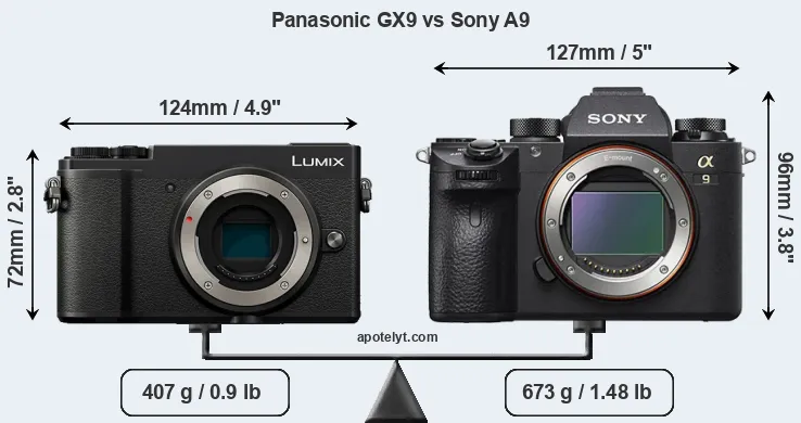 If the front view area (width x height) of the cameras is taken as an aggregate measure of their size, the Sony A9 is notably larger (37 percent) than the Panasonic GX9. Moreover, the A9 is substantially heavier (65 percent) than the GX9. It is noteworthy in this context that the A9 is splash and dust-proof, while the GX9 does not feature any corresponding weather-sealing.