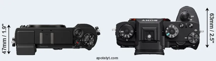 The side-by-side display below illustrates the physical size and weight of the Panasonic GX9 and the Sony A9. The two cameras are presented according to their relative size. Three successive views from the front, the top, and the rear are shown. All width, height and depth measures are rounded to the nearest millimeter.