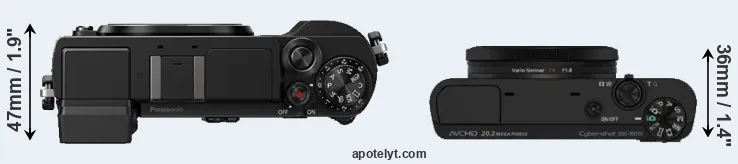 The side-by-side display below illustrates the physical size and weight of the Panasonic GX9 and the Sony RX100. The two cameras are presented according to their relative size. Three consecutive perspectives from the front, the top, and the back are available. All size dimensions are rounded to the nearest millimeter.