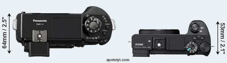 An illustration of the physical size and weight of the Panasonic L1 and the Sony A6500 is provided in the side-by-side display below. The two cameras are presented according to their relative size. Three successive views from the front, the top, and the rear are shown. All size dimensions are rounded to the nearest millimeter.