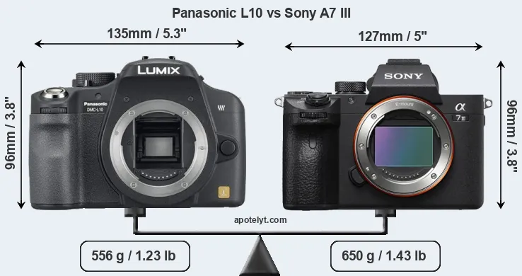 If the front view area (width x height) of the cameras is taken as an aggregate measure of their size, the Sony A7 III is notably smaller (6 percent) than the Panasonic L10. However, the A7 III is markedly heavier (17 percent) than the L10. It is noteworthy in this context that the A7 III is splash and dust-proof, while the L10 does not feature any corresponding weather-sealing.
