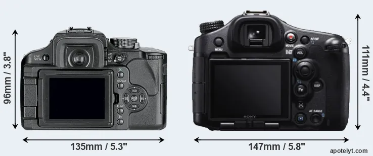 The side-by-side display below illustrates the physical size and weight of the Panasonic L10 and the Sony A99. The two cameras are presented according to their relative size. Three consecutive perspectives from the front, the top, and the back are available. All width, height and depth measures are rounded to the nearest millimeter.