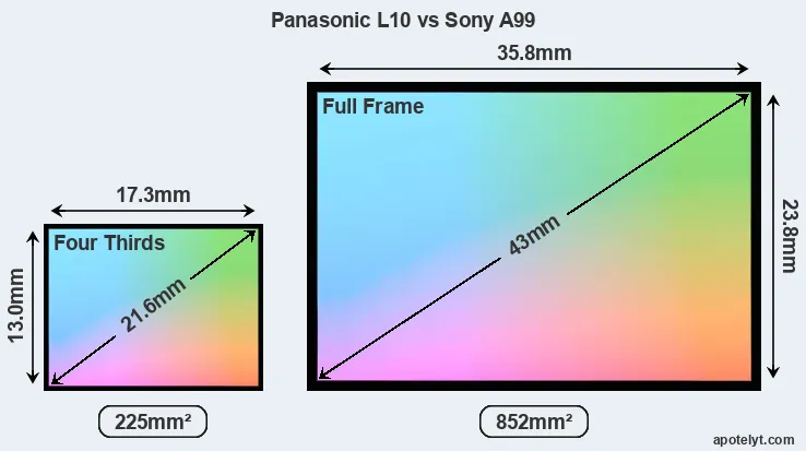 Of the two cameras under consideration, the Panasonic L10 features a Four Thirds sensor and the Sony A99 a full frame sensor. The sensor area in the A99 is 279 percent bigger. As a result of these sensor size differences, the cameras have a format factor of, respectively, 2.0 and 1.0. The sensor in the L10 has a native 4:3 aspect ratio, while the one in the A99 offers a 3:2 aspect.