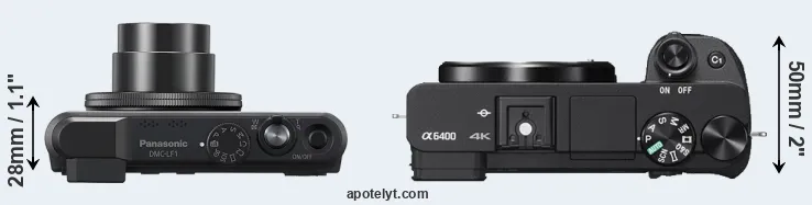 The physical size and weight of the Panasonic LF1 and the Sony A6400 are illustrated in the side-by-side display below. The two cameras are presented according to their relative size. Three successive views from the front, the top, and the rear are shown. All width, height and depth dimensions are rounded to the nearest millimeter.