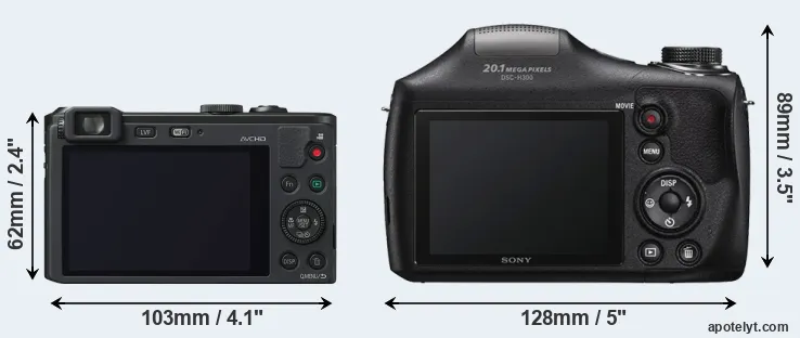 If the front view area (width x height) of the cameras is taken as an aggregate measure of their size, the Sony H300 is considerably larger (78 percent) than the Panasonic LF1. Moreover, the H300 is substantially heavier (207 percent) than the LF1. In this context, it is worth noting that neither the LF1 nor the H300 are weather-sealed.