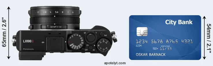 An illustration of the physical dimensions of the Panasonic LX100 II vis-à-vis a credit card is provided in the side-by-side display below. Three consecutive views from the front, the top, and the rear side are shown. All size dimensions are rounded to the nearest millimeter.