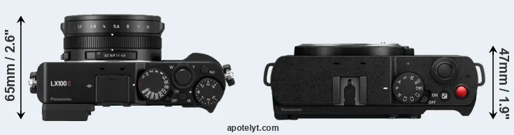 The side-by-side display below illustrates the physical size and weight of the Panasonic LX100 II and the Panasonic S9. The two cameras are presented according to their relative size. Three consecutive perspectives from the front, the top, and the back are available. All width, height and depth measures are rounded to the nearest millimeter.