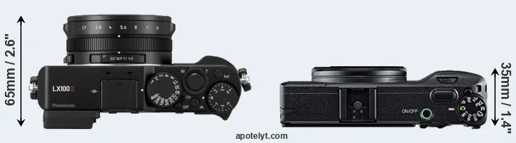 An illustration of the physical size and weight of the Panasonic LX100 II and the Ricoh GR is provided in the side-by-side display below. The two cameras are presented according to their relative size. Three consecutive views from the front, the top, and the rear side are shown. All width, height and depth dimensions are rounded to the nearest millimeter.