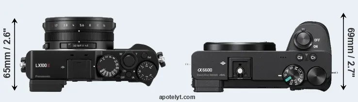 An illustration of the physical size and weight of the Panasonic LX100 II and the Sony A6600 is provided in the side-by-side display below. The two cameras are presented according to their relative size. Three successive views from the front, the top, and the rear are shown. All width, height and depth measures are rounded to the nearest millimeter.
