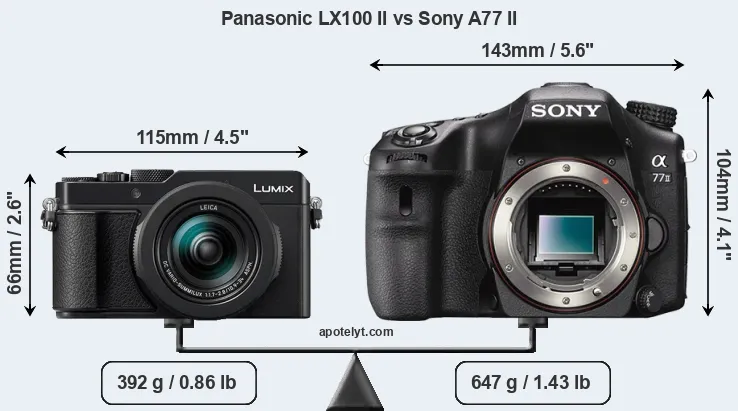 The above size and weight comparisons are to some extent incomplete and possibly misleading, as the LX100 II has a lens built in, whereas the A77 II is an interchangeable lens camera that requires a separate lens. Attaching the latter will add extra weight and bulk to the setup.