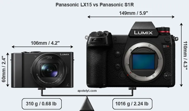 An illustration of the physical size and weight of the Panasonic LX15 and the Panasonic S1R is provided in the side-by-side display below. The two cameras are presented according to their relative size. Three successive views from the front, the top, and the rear are shown. All size dimensions are rounded to the nearest millimeter.