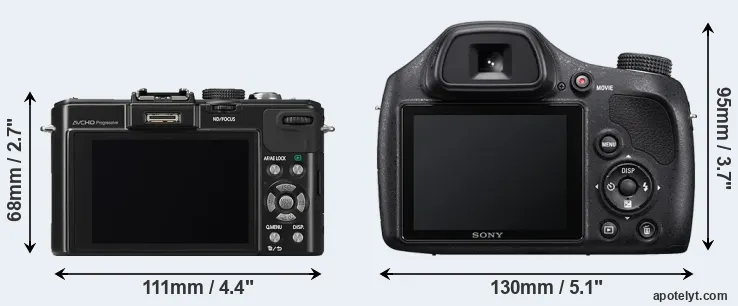 The side-by-side display below illustrates the physical size and weight of the Panasonic LX7 and the Sony H400. The two cameras are presented according to their relative size. Three consecutive views from the front, the top, and the rear side are shown. All width, height and depth dimensions are rounded to the nearest millimeter.