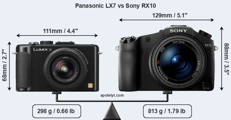 If the front view area (width x height) of the cameras is taken as an aggregate measure of their size, the Sony RX10 is considerably larger (50 percent) than the Panasonic LX7. Moreover, the RX10 is substantially heavier (173 percent) than the LX7. It is noteworthy in this context that the RX10 is splash and dust-proof, while the LX7 does not feature any corresponding weather-sealing.