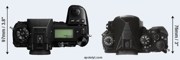 An illustration of the physical size and weight of the Panasonic S1 and the Pentax KP is provided in the side-by-side display below. The two cameras are presented according to their relative size. Three consecutive views from the front, the top, and the rear side are shown. All size dimensions are rounded to the nearest millimeter.