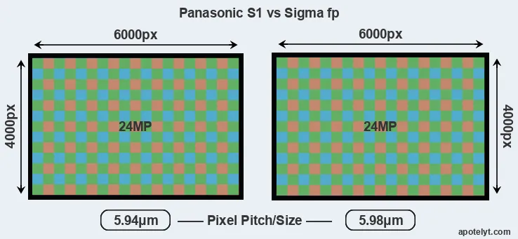 Even though the fp has a slightly larger sensor, both cameras offer the same resolution of 24 megapixels. This implies that the fp has a lower pixel density and marginally larger individual pixels (with a pixel pitch of 5.98μm versus 5.94μm for the S1), which gives it a potential advantage in terms of light gathering capacity. In addition, the fp is a somewhat more recent model (by 5 months) than the S1, and its sensor might have benefitted from technological advances during this time. Coming back to sensor resolution, it should be mentioned that neither of the two cameras has an anti-alias filter installed, so they are able to capture all the detail the sensor resolves.