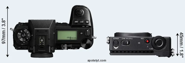 The physical size and weight of the Panasonic S1 and the Sigma fp are illustrated in the side-by-side display below. The two cameras are presented according to their relative size. Three successive views from the front, the top, and the rear are shown. All width, height and depth measures are rounded to the nearest millimeter.