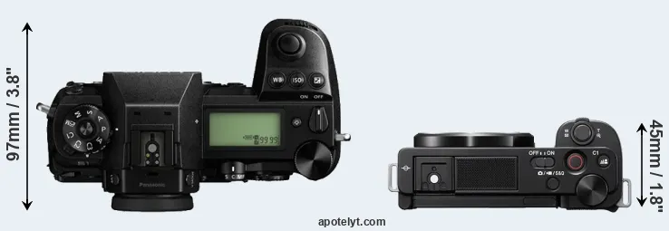 The side-by-side display below illustrates the physical size and weight of the Panasonic S1 and the Sony ZV-E10. The two cameras are presented according to their relative size. Three consecutive perspectives from the front, the top, and the back are available. All size dimensions are rounded to the nearest millimeter.