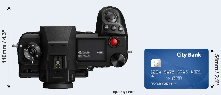 The side-by-side display below illustrates the physical size of the Panasonic S1H vis-à-vis a credit card. Three successive views from the front, the top, and the rear are shown. All width, height and depth dimensions are rounded to the nearest millimeter.