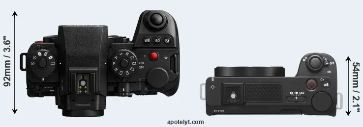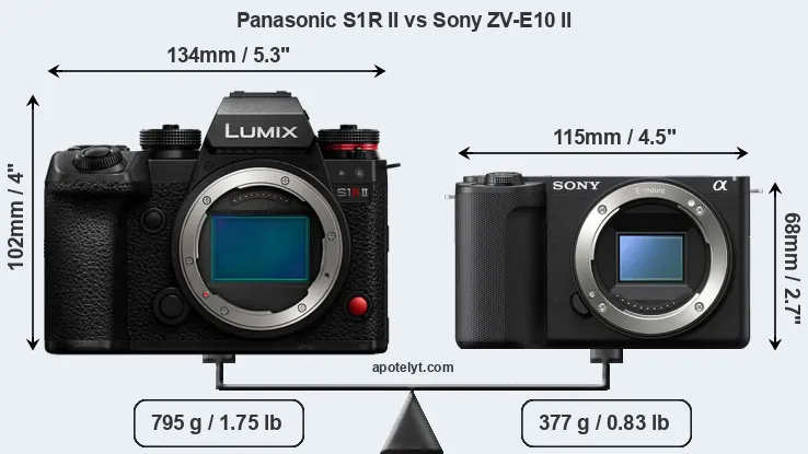 The physical size and weight of the Panasonic S1R II and the Sony ZV-E10 II are illustrated in the side-by-side display below. The two cameras are presented according to their relative size. Three successive views from the front, the top, and the rear are shown. All width, height and depth measures are rounded to the nearest millimeter.