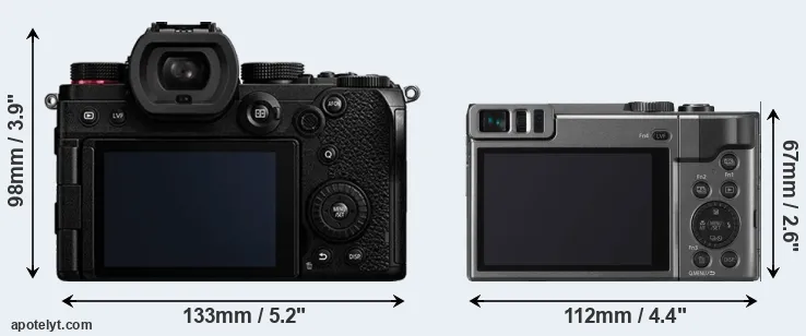 If the front view area (width x height) of the cameras is taken as an aggregate measure of their size, the Panasonic TZ90 is considerably smaller (42 percent) than the Panasonic S5. It is worth mentioning in this context that the S5 is splash and dust resistant, while the TZ90 does not feature any corresponding weather-sealing.
