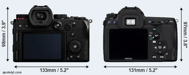 The side-by-side display below illustrates the physical size and weight of the Panasonic S5 and the Pentax K-5. The two cameras are presented according to their relative size. Three consecutive views from the front, the top, and the rear side are shown. All size dimensions are rounded to the nearest millimeter.