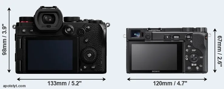 The physical size and weight of the Panasonic S5 and the Sony A6100 are illustrated in the side-by-side display below. The two cameras are presented according to their relative size. Three consecutive views from the front, the top, and the rear side are shown. All size dimensions are rounded to the nearest millimeter.