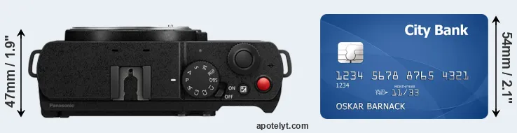 An illustration of the physical dimensions of the Panasonic S9 vis-à-vis a credit card is provided in the side-by-side display below. Three successive views from the front, the top, and the rear are shown. All size dimensions are rounded to the nearest millimeter.