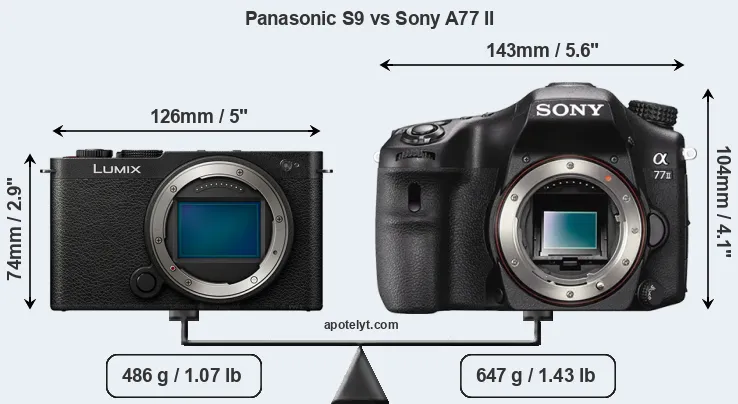 If the front view area (width x height) of the cameras is taken as an aggregate measure of their size, the Sony A77 II is considerably larger (60 percent) than the Panasonic S9. Moreover, the A77 II is markedly heavier (33 percent) than the S9. It is noteworthy in this context that the A77 II is splash and dust-proof, while the S9 does not feature any corresponding weather-sealing.