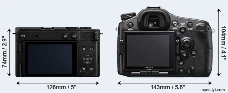 The physical size and weight of the Panasonic S9 and the Sony A77 II are illustrated in the side-by-side display below. The two cameras are presented according to their relative size. Three successive views from the front, the top, and the rear are shown. All width, height and depth measures are rounded to the nearest millimeter.