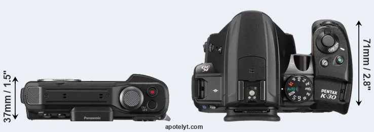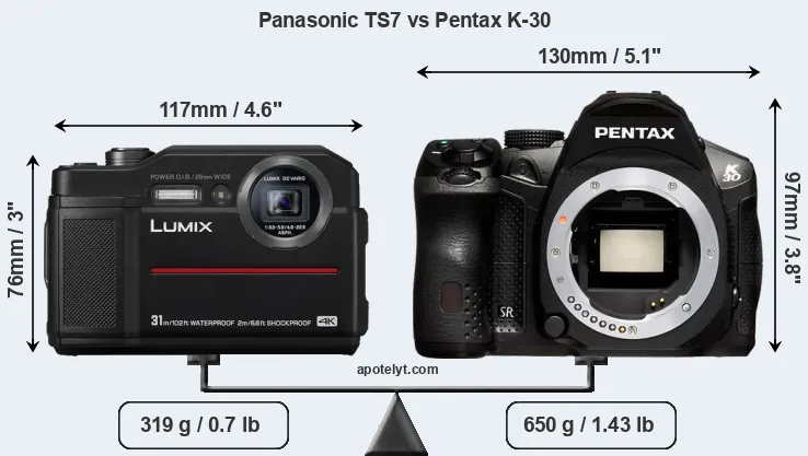 The side-by-side display below illustrates the physical size and weight of the Panasonic TS7 and the Pentax K-30. The two cameras are presented according to their relative size. Three consecutive perspectives from the front, the top, and the back are available. All width, height and depth measures are rounded to the nearest millimeter.