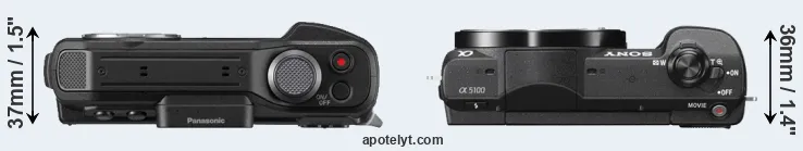 An illustration of the physical size and weight of the Panasonic TS7 and the Sony A5100 is provided in the side-by-side display below. The two cameras are presented according to their relative size. Three consecutive views from the front, the top, and the rear side are shown. All size dimensions are rounded to the nearest millimeter.