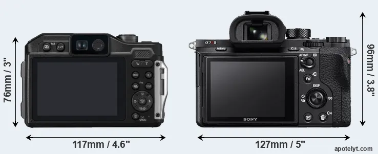 The side-by-side display below illustrates the physical size and weight of the Panasonic TS7 and the Sony A7R II. The two cameras are presented according to their relative size. Three successive views from the front, the top, and the rear are shown. All width, height and depth dimensions are rounded to the nearest millimeter.