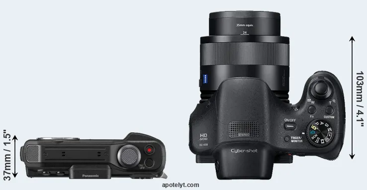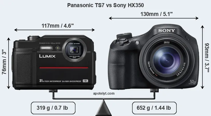 An illustration of the physical size and weight of the Panasonic TS7 and the Sony HX350 is provided in the side-by-side display below. The two cameras are presented according to their relative size. Three successive views from the front, the top, and the rear are shown. All width, height and depth measures are rounded to the nearest millimeter.