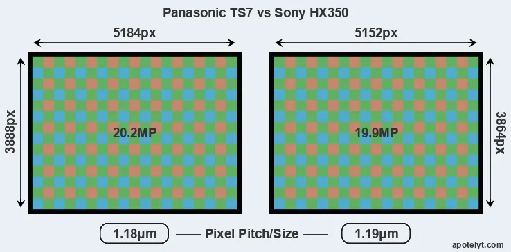 While the two cameras under review share the same sensor size, the TS7 offers a slightly higher resolution of 20.2 megapixels, compared with 19.9 MP of the HX350. This megapixels advantage translates into a 0.59999999999999 percent gain in linear resolution. On the other hand, these sensor specs imply that the TS7 has a higher pixel density and a smaller size of the individual pixel (with a pixel pitch of 1.18μm versus 1.19μm for the HX350). In this context, it should be noted, however, that the TS7 is a somewhat more recent model (by 1 year and 4 months) than the HX350, and its sensor might have benefitted from technological advances during this time that at least partly compensate for the smaller pixel size. Coming back to sensor resolution, it should be mentioned that the HX350 has no anti-alias filter installed, so that it can capture all the detail its sensor resolves.