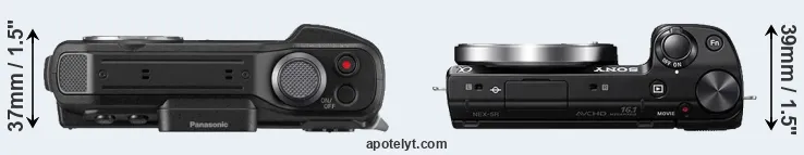 The physical size and weight of the Panasonic TS7 and the Sony NEX-5R are illustrated in the side-by-side display below. The two cameras are presented according to their relative size. Three consecutive perspectives from the front, the top, and the back are available. All width, height and depth dimensions are rounded to the nearest millimeter.