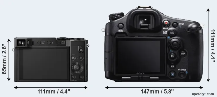 The side-by-side display below illustrates the physical size and weight of the Panasonic TZ100 and the Sony A99. The two cameras are presented according to their relative size. Three consecutive perspectives from the front, the top, and the back are available. All width, height and depth measures are rounded to the nearest millimeter.