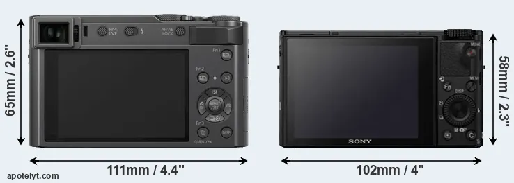 The side-by-side display below illustrates the physical size and weight of the Panasonic TZ200 and the Sony RX100 IV. The two cameras are presented according to their relative size. Three consecutive views from the front, the top, and the rear side are shown. All size dimensions are rounded to the nearest millimeter.