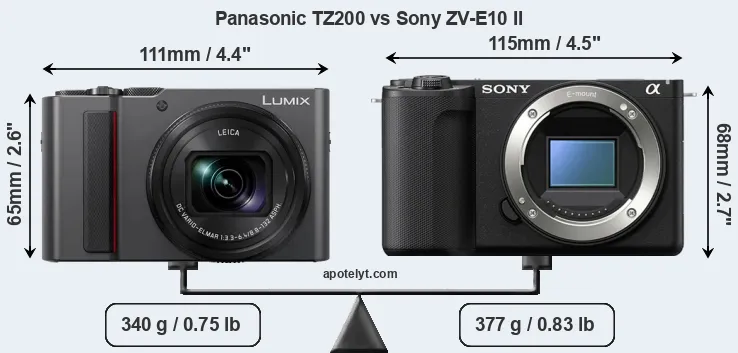 An illustration of the physical size and weight of the Panasonic TZ200 and the Sony ZV-E10 II is provided in the side-by-side display below. The two cameras are presented according to their relative size. Three consecutive perspectives from the front, the top, and the back are available. All width, height and depth measures are rounded to the nearest millimeter.