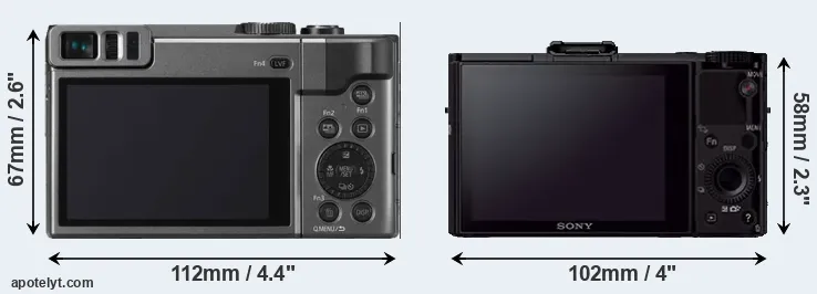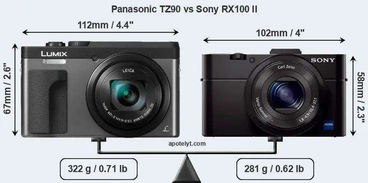 The side-by-side display below illustrates the physical size and weight of the Panasonic TZ90 and the Sony RX100 II. The two cameras are presented according to their relative size. Three consecutive perspectives from the front, the top, and the back are available. All size dimensions are rounded to the nearest millimeter.