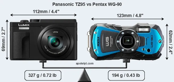 The side-by-side display below illustrates the physical size and weight of the Panasonic TZ95 and the Pentax WG-90. The two cameras are presented according to their relative size. Three consecutive views from the front, the top, and the rear side are shown. All width, height and depth measures are rounded to the nearest millimeter.