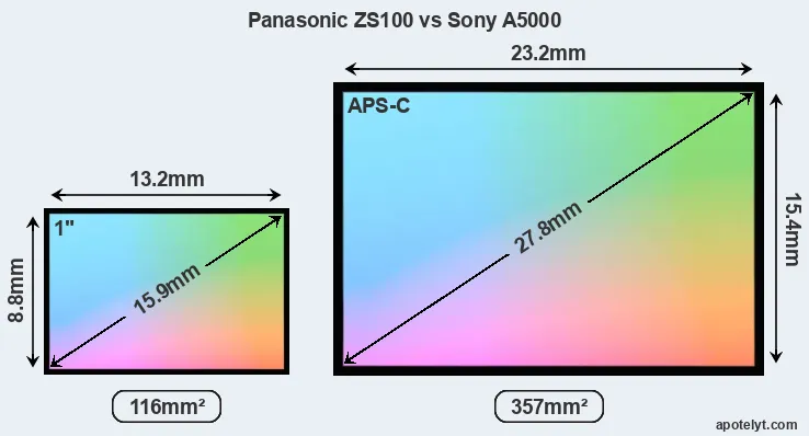Of the two cameras under consideration, the Panasonic ZS100 features an one-inch sensor and the Sony A5000 an APS-C sensor. The sensor area in the A5000 is 208 percent bigger. As a result of these sensor size differences, the cameras have a format factor of, respectively, 2.7 and 1.5. Both cameras have a native aspect ratio (sensor width to sensor height) of 3:2.